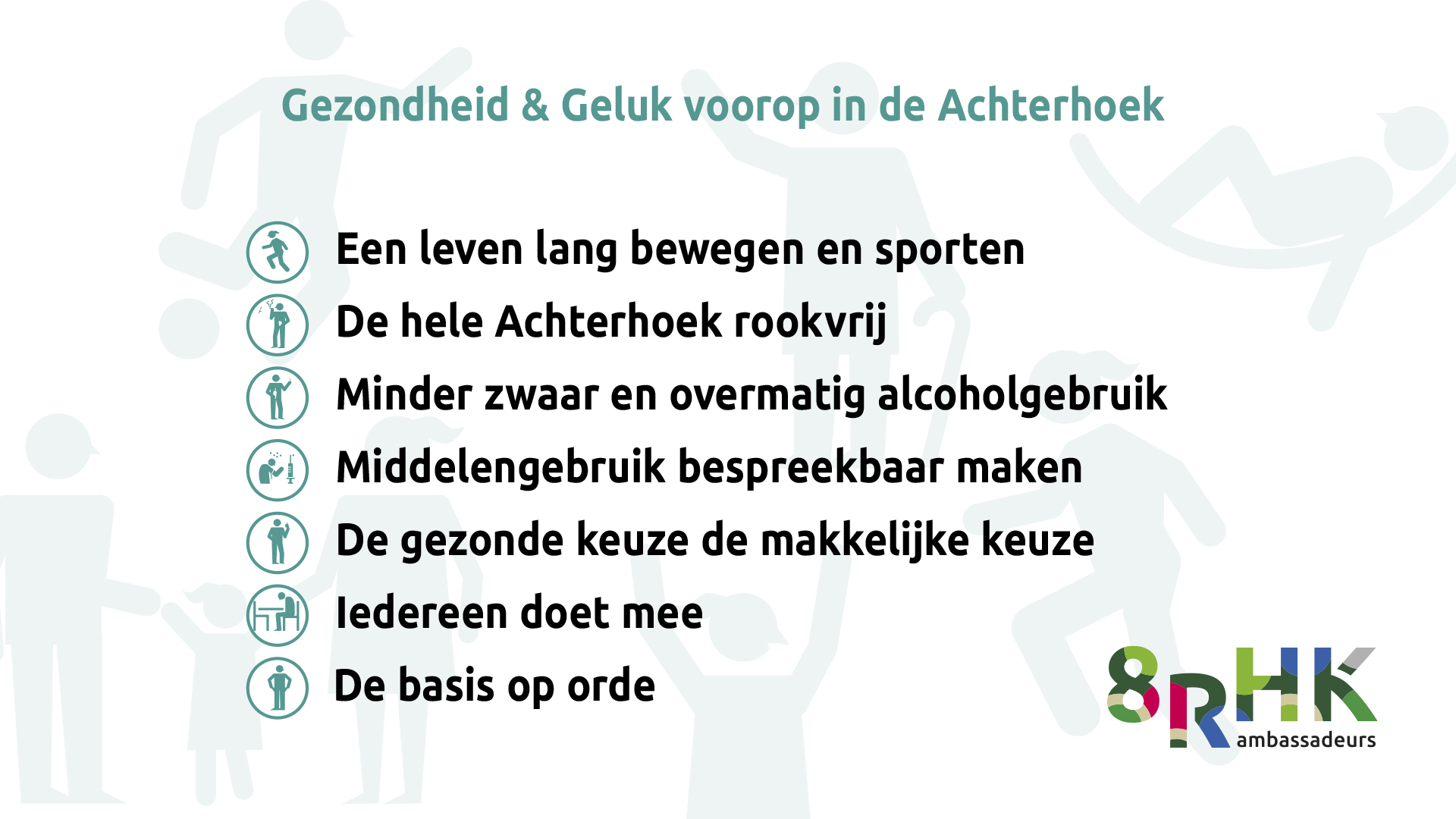 Om preventie breed in te zetten, zijn veel verschillende partijen nodig. De ondertekenaars van het akkoord variëren dan ook van overheden, zorgaanbieders en zorgverzekeraars tot onderwijs, ondernemers en maatschappelijke organisaties. Samen werken zij aan preventie en inspireren, motiveren en faciliteren zij inwoners op een uitnodigende manier om gedragspatronen te doorbreken die een gezond leven in de weg staan, zodat zij meer en meer de regie krijgen over hun eigen leven. In het akkoord staan zeven speerpunten centraal: Een leven lang bewegen en sporten, De hele Achterhoek rookvrij, Minder zwaar en overmatig alcoholgebruik, Middelengebruik bespreekbaar maken, De gezonde keuze de makkelijke keuze, Iedereen doet mee en De basis op orde. De komende tijd worden nieuwe programma’s gestart; bestaande programma’s worden verdiept en/of uitgebreid. Ook komt er een Achterhoekmonitor om de voortgang continu te kunnen volgen. Stip op de horizon is een regio met zoveel mogelijk gezonde en gelukkige inwoners.