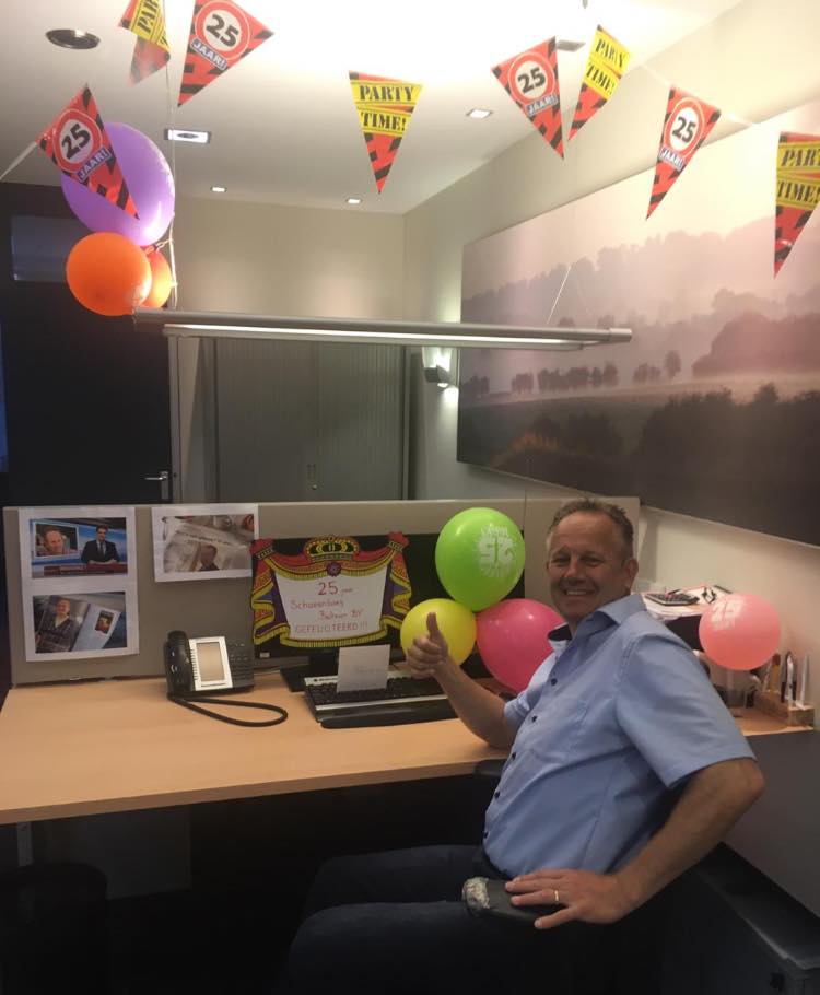 BELTRUM – Een klein feestje vandaag (woensdag 9 september) bij Scharenborg Beltrum B.V. Eddy Groot Zevert is namelijk vandaag al 25 jaar in dienst bij de expert op het gebied van verzekeringen, hypotheken en complete financiële planning. Eddy zijn werkplek werd volop versiert, zodat niemand het kon missen dat er iets te vieren viel vandaag.