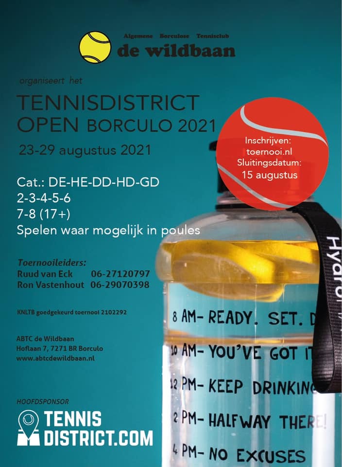 BORCULO – Na een jaar zonder toernooien, competitie en gezelligheid in en om de kantine van ABTC De Wildbaan komt het normale leven langzaam weer op gang. De toernooicommissie van de Borculose tennisclub heeft daarom goed nieuws : het Tennisdistrict Open Borculo 2021 toernooi gaat door en de tennissers zijn van 23 t/m 29 augustus 2021 welkom op Borculose banen. Hierbij gaat de organisatie uit van de huidige situatie en is men natuurlijk wel afhankelijk van geldende coronamaatregelen.