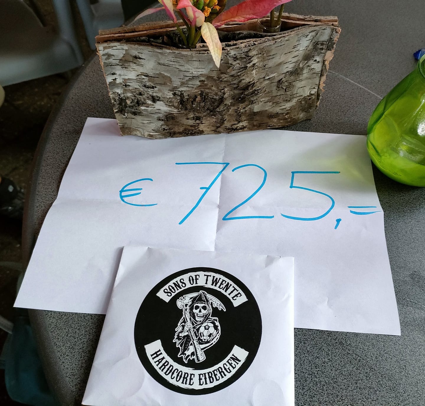 EIBERGEN – “Wát een enorme verrassing”. Dat was de reactie van de Stichting Kinderdagkamp uit Eibergen. Hardcore Eibergen verraste de stichting op de laatste dag van haar kamp met een geldbedrag van €725,-. Hardcore Eibergen had in de krant gelezen dat de Stichting Kinderkamp een wens had voor het kamp: een nieuwe overkapping. Dat heeft Hardcore Eibergen aan het denken en werk gezet. “Dit geweldige bedrag wisten ze in één dag bij elkaar te leggen. Wat een toppers!”. De stichting zal de komende tijd goed uitzoeken wat de beste optie is voor een nieuwe overkapping, zodat ze dit mooie bedrag goed kunnen investeren. Hardcore Eibergen is een onofficiële maar zéér fanatieke supportersvereniging van FC Twente. Daarnaast zetten zij zich ook in voor de middenstand in en rondom Eibergen met diverse acties.