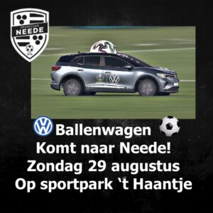 NEEDE – Wie had dat gedacht, van een ludieke actie na veel bier, naar een wedstrijd met de echte Volkswagen ID 4! Opsteker voor voetbalfans: het EK krijgt een nabrandertje in…….jawel Neede! UEFA sponsor Volkswagen komt met de ID.4-‘ballenwagen’ zondag 29 augustus de bal naar de middenstip brengen op sportpark ’t Haantje. En wel voor de ‘interland’ tussen Sportclub Neede 6/7 tegen het altijd lastige Neede/Noordijk 8.