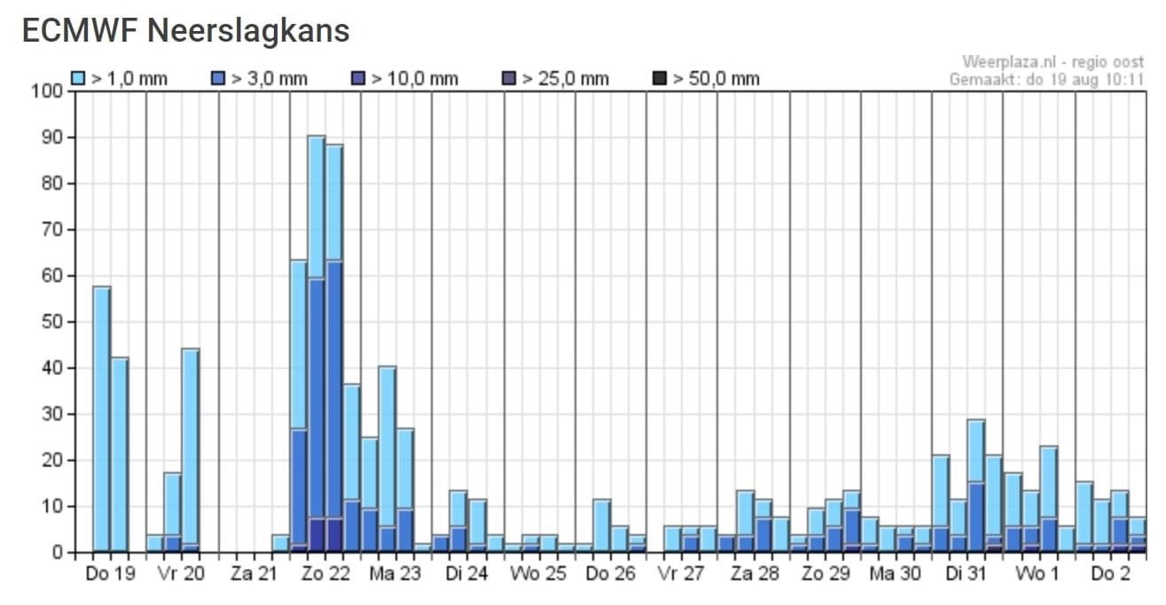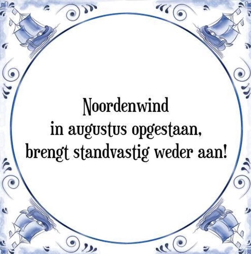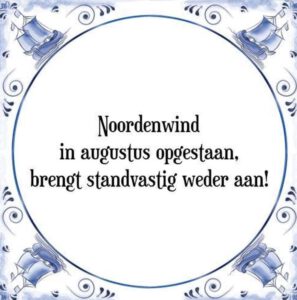BERKELLAND – Of bijgaande weerspreuk van toepassing is weet ik niet, maar het weer dat we nu bijna al de hele zomer hebben lijkt van geen wijken te weten. Zaterdag is weliswaar even een uitzondering met wat hogere temperatuur en wat meer zon, maar vanaf zondag gaan we weer in het bekende patroon verder. Met een wind uit overwegend noordelijke richting wordt het gemiddeld niet warmer dan 20/21 graden, is er af en toe zon en valt er ook af en toe een bui. Niet slecht, maar ook niet uitgesproken zomers. En zo glijden we alweer langzaam de (meteorologische) herfst in. Maar wellicht gaat september de zomerliefhebbers nog even verwennen…………?