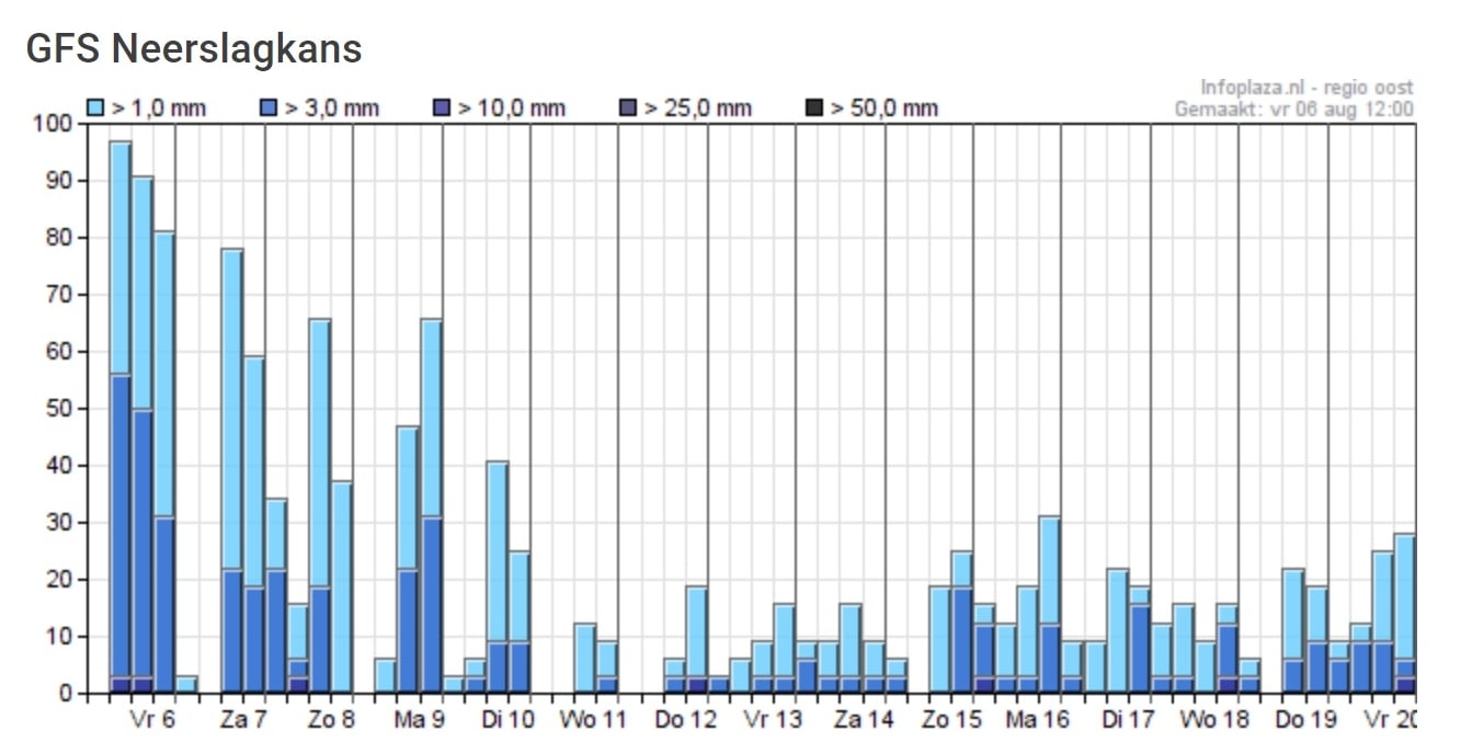 BERKELLAND – Hoewel je het niet echt slecht weer kunt noemen, is het ook niet volop zomers zoals we dat de afgelopen jaren meemaakten. Ook komend weekeinde zal niet droog verlopen en is met iets meer dan 20 graden aan de koele kant voor de tijd van het jaar. Na het weekeinde lijkt het weer langzaam wat te stabiliseren en kunnen we mogelijk een paar droge dagen tegemoet zien. Ook kan het dan even boven de 25 graden worden. Het is echter hoogst onzeker of dat ook echt gaat doorzetten. Oceaandepressies liggen dan op de loer om het roer hier weer over te nemen. Dus na het weekeinde maar eens kijken of augustus toch nog een zomers gezicht gaat krijgen of dat het opnieuw meer van hetzelfde wordt.