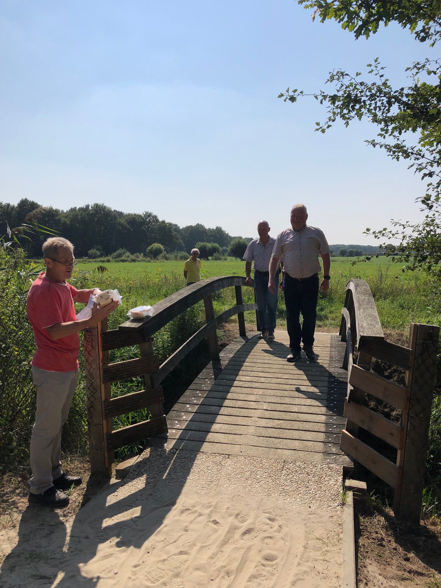 Om 14.00 uur werd de kinderspeelplek op het natuurpark officieel geopend die dankzij een grote anonieme gift gerealiseerd kon worden. Veel kinderen zullen hier plezier aan beleven. Als klap op de vuurpijl schoot vervolgens Hans Grooters waterraketten hoog het weiland in om de ingebruikname van de brug, die afkomstig is uit Sint Isidorushoeve, in te luiden. De heren Herman Asbroek en Tonnie Rupert, beiden afkomstig uit Sint Isidorushoeve, zijn al wandelend over de brug aan de overkant ontvangen door Jan Lansink van het natuurpark en hebben op deze wijze de officiele openingshandeling verricht. Op deze manier is er een mooie brug geslagen tussen ‘de Hoeve’ en Neede en zo ook tussen het park en het toekomstige voedselbos.