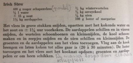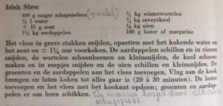 Beiden: “Pannenkoeken gaan er altijd in. Janny: “Liefst met spek! En als je er over hebt, met een aluminiumfolie ertussen zo de diepvries in en later opbakken. Heerlijk! Maar…. voor zo’n grote groep pannenkoeken bakken lijkt me een hele toer.” Mina: “”Van de huishoudschool blijft me bij dat ik van juffrouw van de Burg Irish Stew (Ierse stoofpot) moest koken. Dat was me toch lekker.” Janny: “We zullen er mijn ‘Neerlands Kookboek’ wat ik in 1951 op diezelfde huishoudschool gebruikte, eens op naslaan. Wat zie ik, het recept staat er nog in ook.” Mina: “Nou, dat mag je wel als tip doorgeven aan de koks van het Eetcafé. Dan kom ik nog een keer extra!”<