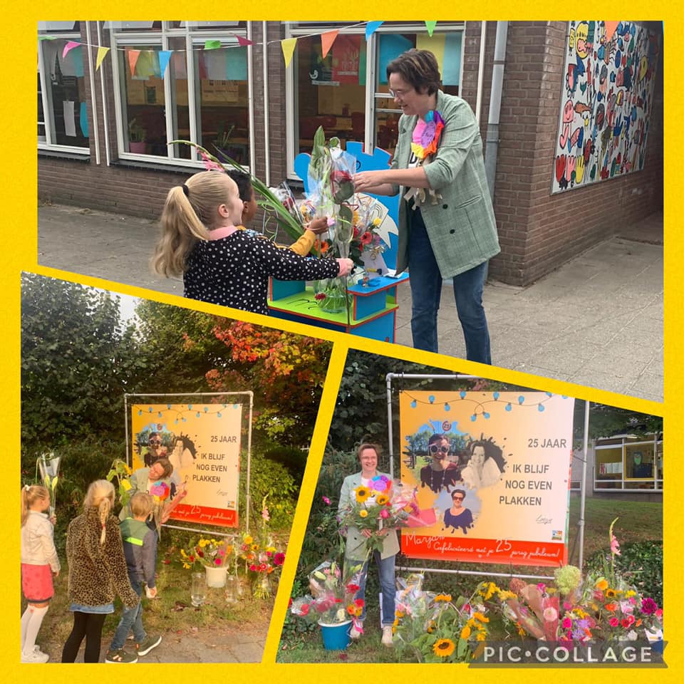 EIBERGEN – Juf Marjan werkt inmiddels 25 jaar bij stichting Oponoa, daarom werd ze maandagmorgen verrast met bloemen. Collega’s en kinderen hadden dit stiekem voorbereid waardoor er een ware bloemenzee ontstond. “Van harte gefeliciteerd met dit jubileum en nog vele (onderwijs)jaren gewenst!”. Zo zegt de school op haar facebookpagina.