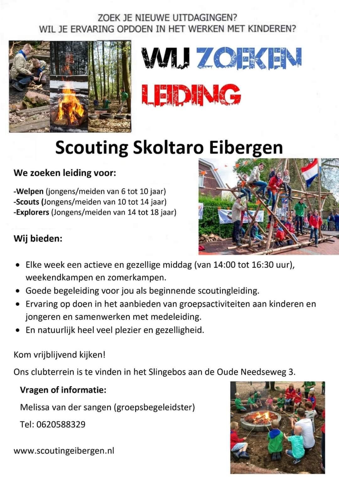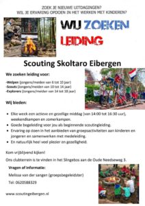 EIBERGEN- Scouting Skoltaro uit Eibergen is vorige week begonnen aan een nieuw scouting seizoen. Het afgelopen jaar heeft Skoltaro haar ledenaantal zien groeien, uiteraard is men als scouting groep in Eibergen bijzonder trots op deze toename. Echter bij een groter aantal leden is ook meer leiding nodig. Daarom is Skoltaro naarstig opzoek naar mensen die als leiding willen fungeren binnen de diverse groepen. Op de onderstaande flyer zie je waar de behoefte ligt. Interesse? Neem dan snel contact op.