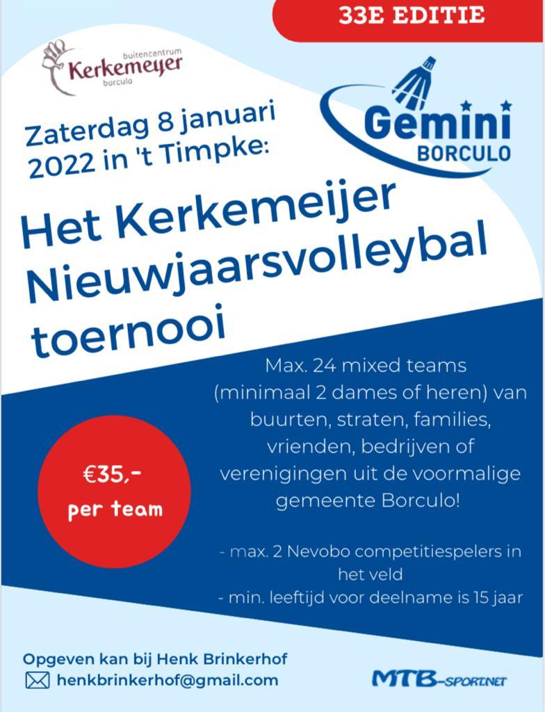 BORCULO – De 33e editie van het recreatieve Kerkemeijer Nieuwjaarsvolleybaltoernooi kon in januari van dit jaar vanwege corona helaas geen doorgang vinden. De Evenementen Commissie van volleybalvereniging Kerkemeijer Gemini organiseert deze editie nu op zaterdag 8 januari 2022 in sporthal ’t Timpke.