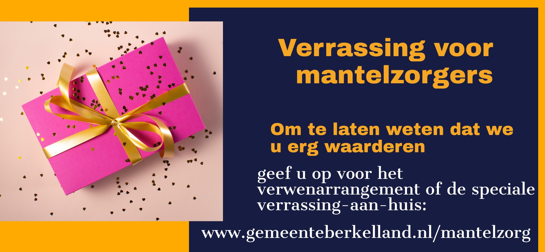 Op http://www.gemeenteberkelland.nl/mantelzorg vindt u een aanmeldformulier. Door het invullen van dit formulier meldt u zich aan voor het verwenarrangement of voor het ontvangen van een verwenattentie. Het kan zijn dat u zorgt voor een inwoner van Berkelland, maar dat u zelf niet in onze gemeente woont. Vul dan een Berkellands adres in waar we uw verrassing kunnen afgeven. Bent u niet in staat een formulier in te vullen, vraag dan hulp van mensen om u heen of bel naar het gemeentehuis: 0545-250 250.