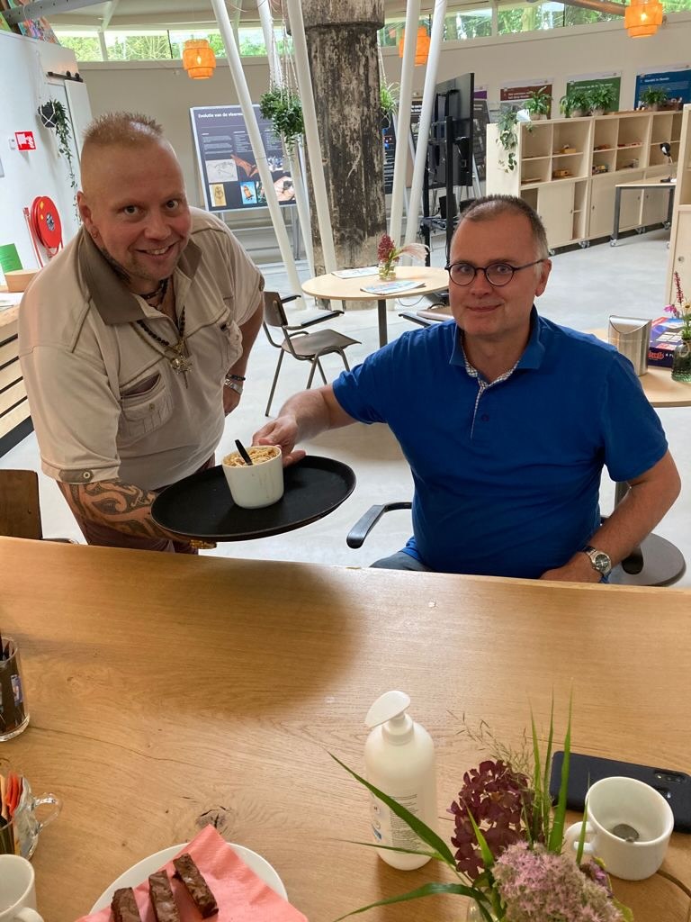 Bezoekers kunnen tijdens de lunch voor een kleine eigen bijdrage van €1,- gezellig samen eten. Bezoeker Marco Nijman doet ‘s morgens de boodschappen, bereid de lunch in de keuken en serveert rond lunchtijd uit. Vooraf aanmelden is niet nodig. Vooral Marco zijn soep is een specialiteit dus op is helaas echt op. “In de maand september trakteerden wij op koffie en thee met wat lekkers. Vanaf oktober vragen wij €0.50 voor een kopje koffie of thee”. Zegt Soraya Wittebroek Coördinator Dorpskamers Berkelland.