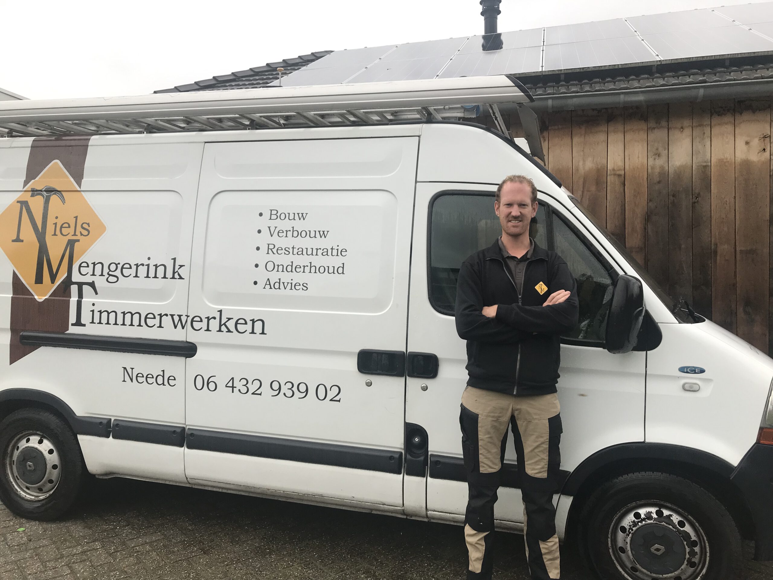 Als jonge ondernemer heeft Niels Mengerink 5 jaar geleden de stap gezet om voor zichzelf te gaan werken. Zijn werk is zeer divers. Van het vervangen van een deur tot een complete verbouwing van een woning of het maken van een maatwerk trap in zijn werkplaats. Hij neemt ook grotere werken aan en werkt hierbij samen met een vaste club zzp timmerlieden. “Het mooiste vind ik het als ik mee mag kijken in de ontwerpfase en hier al mijn ervaring en creatieve gedachten mee kan laten wegen in het uiteindelijke ontwerp. Bij tuinoverkappingen bijvoorbeeld maak ik altijd een schetsontwerp samen met de klant. Zo wordt er geen één hetzelfde.”