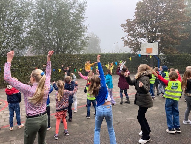 Vervolgens werd de dans van Kinderen voor Kinderen door alle leerlingen en peuters gedanst op het plein. Met als afsluiter een raadspel over het beroep dat de leerkracht deze ochtend had uitgebeeld. – Juf, zo wil ik iedere dag mijn schooldag wel starten!-