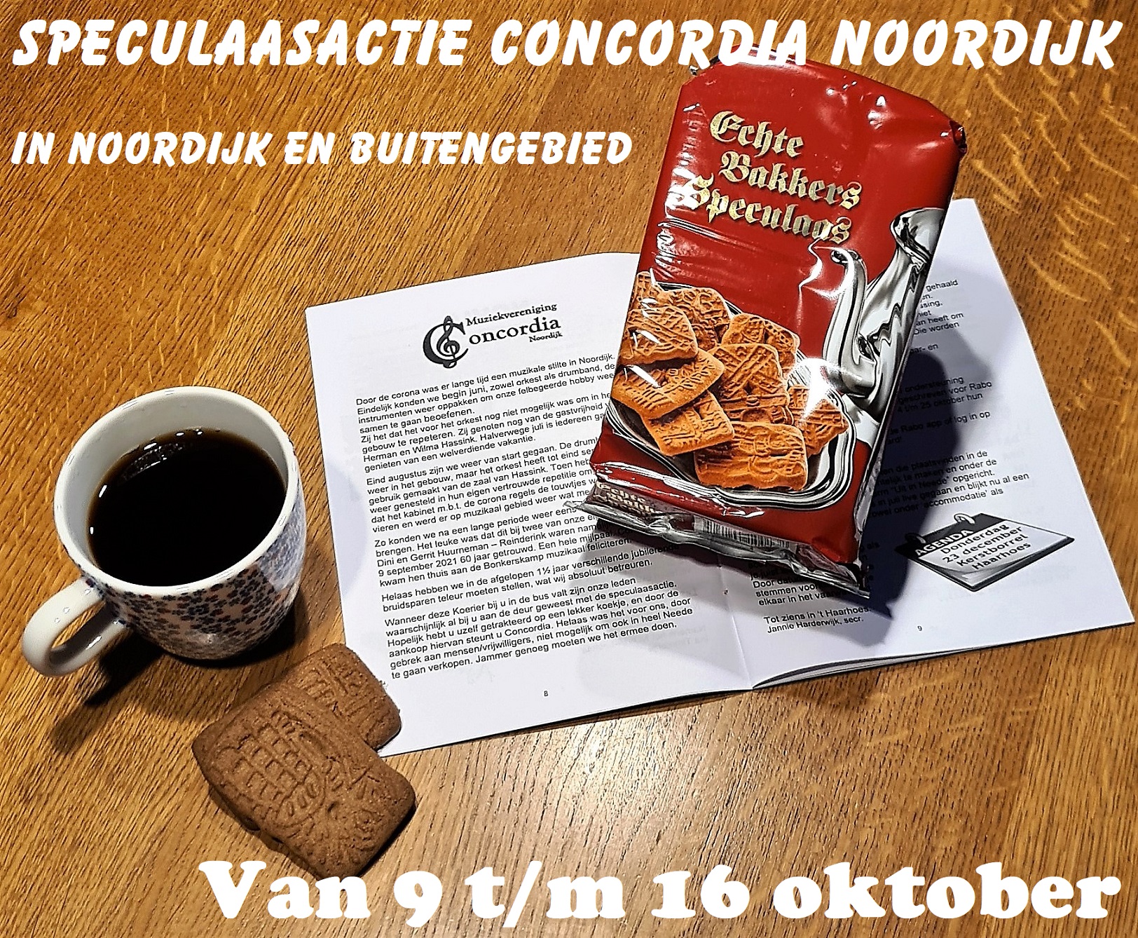 NOORDIJK – Van 9 oktober t/m 16 oktober gaat Muziekvereniging Concordia Noordijk huis aan huis rond in Noordijk en het buitengebied voor de verkoop van speculaas. Trakteer u zelf met deze koude herfstdagen op een lekker speculaasje bij de koffie en u steunt onze vereniging.