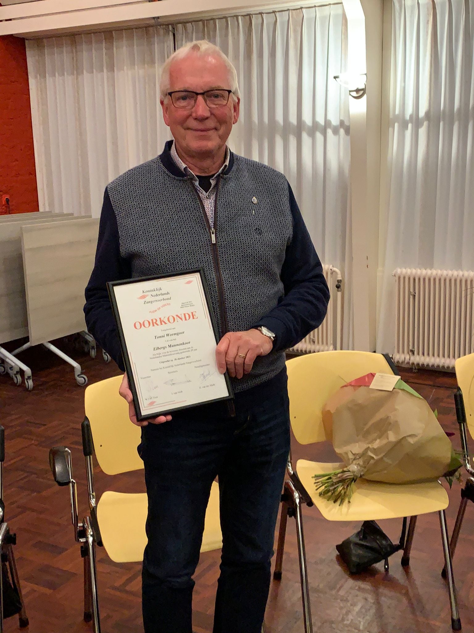 EIBERGEN – Donderdagavond is Tonni Wormgoor gehuldigd bij het Eibergs Mannenkoor voor zijn 25 jarig lidmaatschap. “Bloemen voor Riekie, speldje en oorkonde voor mij. Een prachtig koor. Een genot om lid van te mogen zijn”. Is de reactie van de Eibergenaar, “Mannen die aan zingen plezier beleven moeten mij echt bellen. Zal ze de weg wijzen naar een ontspannen donderdagavond”.