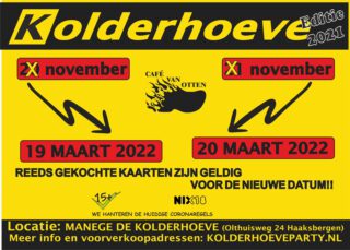 RIETMOLEN – De voorbereidingen waren al in volle gang, de kaartverkoop liep als een trein en de organisatie had er zin in. De persconferentie die het kabinet vrijdagavond hield zette abrupt een streep door alle vreugde. De Kolderhoeveparty kan volgend weekend niet doorgaan. Janny Rupert laat namens de organisatie weten dat het gehele evenement is verplaatst naar maart volgend jaar. “Op zaterdag 19 en zondag 20 maart 2022 gaan we een nieuwe poging wagen. De gekochte kaarten voor dit weekend zijn geldig voor de nieuwe datum”.