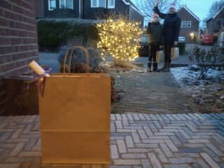 Deze werd snel gevonden en woensdagavond kregen alle kinderen van Het Sterrenpalet thuis bezoek van de leden van de ouderraad en ontvingen ze een tasje met kleurplaten, een attentie voor in de kerstboom, een bakmix om lekkere winterse feestkoekjes te maken, een passend gedicht voor de tijd van het jaar en voor de ouders/verzorgers een mooie kaars.