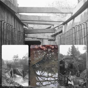 Peter Nieuwenhuis legt uit: “Al vanaf zaterdag is er een lekkage, door de lekkage is de duiker zichtbaar geworden. De Leerinkbeek ligt rechts van de IJsbaan. Vroeger liep er een duiker onder de parkeerplaats onder de Hoflaan door, om vervolgens achter de tuinen aan de Scheijlaan onder het gele paadje tot aan de Bloemersstraat. De duiker ligt er nog vanaf het gele paadje tot de kastanje. Vanuit de werkgroep van de oude haven hopen we straks de duiker te kunnen opstellen, zodat je een overdekte “blote voetenpad” krijgt door de duiker vanaf de oude haven naar de Bloemersstraat”