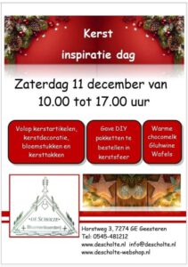 GEESTEREN – Aanstaande zaterdag organiseert Bloemenboerderij ‘de Scholte’ aan de Horstweg 3 in Geesteren een kerstinspiratie dag. Iedereen is tussen 10.00 en 17.00 uur van harte welkom. Direct nadat de Sint weer naar Spanje is, kan men zich in de kerstsfeer storten.