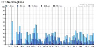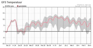 Tweede kerstdag wil een (regen)front vanuit het zuiden oprukken en als dat slaagt gaan dan de temperaturen weer omhoog en valt er wat regen. Het blijft dus best een spannende situatie die met een kleine verschuiving zomaar een andere weerssituatie kan opleveren. In ieder geval is het bij dit soort omstandigheden goed om de berichten in de gaten te houden als je de weg op moet. Na kerst lijkt het weer opnieuw onder invloed te komen van oceaandepressies, met temperaturen van soms ruim 10 graden en regelmatig wat regen. Ook met de jaarwisseling is dat waarschijnlijk het scenario. Uw weerman wenst u een fijne kerst en blijf gezond!