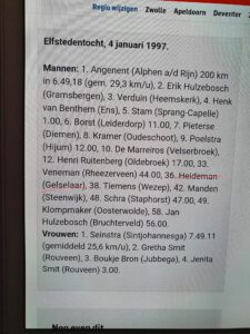 GELSELAAR – Vandaag wordt er veel teruggeblikt op 25 jaar geleden, op 4 januari 1997 werd namelijk de tot nu toe laatste Elfstedentocht verreden. Sinds die dag is Wim Weenk uit Geesteren de rode lantaarn drager. Weenk kwam tijdens de tocht van 1997 als aller laatste binnen de tijd over de finish in Leeuwarden. Marathonschaatser Jan Maarten Heideman, die toen in Gelselaar woonde, kwam als 36ste over de finish. Op een dag als deze komen die herinneringen weer boven.