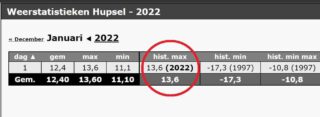 BERKELLAND – Om te beginnen wens ik iedereen een voorspoedig en bovenal gezond 2022. Zoals verwacht zijn er de afgelopen dagen vele temperatuurrecords gebroken in Nederland. Zo ook in Berkelland. Het was hier dan ook de warmste 1 januari ooit, met 13,6 graden. Dat gaat nu veranderen met een meer westelijke stroming. De komende week is het opnieuw een komen en gaan van storingen vanuit het westen, met regelmatig regen en gepaard gaande met een stevige wind. De temperatuur zakt geleidelijk naar gemiddeld 5 graden vanaf het midden van de week, waarmee ook een enkele sneeuwvlok en wat nachtvorst mogelijk wordt. Van een echte winterse periode is echter nog geen sprake. Ook voor de week daarna geven de weermodellen geen winterse indicaties.