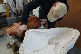 Ter Braak zit goed op schema met de vervaardiging van het borstbeeld Sluiter. Na voltooiing van zijn boetseerwerk vervaardigde Ter Braak een mal van gips met daarin een laag van siliconen. Vervolgens bracht hij een laag was aan. Die weekte hij recent los en bewerkt hij nog voorzichtig. Daarna is alles gereed voor het in brons gieten van zijn werk.