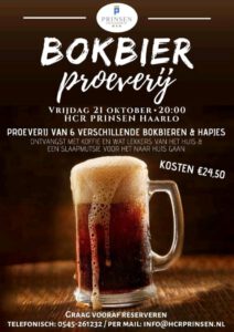 HAARLO – Op vrijdag 21 oktober aanstaande organiseert Hotel Café Restaurant Prinsen in Haarlo een bokbierproeverij. “We gaan 6 verschillende bokbieren proeven en serveren er uiteraard wat lekkere hapjes bij”. Legt Tineke Wantia van HCR Prinsen uit. “Na de proeverij kun je uiteraard je favoriete biertje nog uitgebreid naproeven”. Voor maar € 24,50 per persoon krijg je bij ontvangst een kopje koffie met wat lekkers, proef je 6 verschillende bokbieren en krijg je een slaapmutsje voor het naar huis gaan.