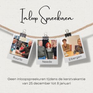 BERKELLAND – De wekelijkse inloopspreekuren in Ruurlo, Neede, Eibergen en Beltrum gaan in de kerstvakantie van 25 december tot 8 januari niet door.