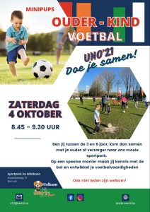 BORCULO – Ben je benieuwd of voetbal iets is voor jouw kind? Kom dan kennismaken met UNO’21 tijdens het speciale ouder-kind voetbal evenement. Op zaterdag 4 oktober wordt er om 08:45 uur afgetrapt op het hoofdveld bij UNO’21 op Sportpark De Wildbaan in Borculo. Dit evenement is speciaal georganiseerd voor alle kinderen van 3 tot en met 5 jaar oud. Aanmelden is niet nodig, dus kom gewoon langs.