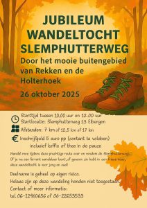 REKKEN/EIBERGEN – Op zondag 26 oktober 2025 wordt de jubileumeditie van de Wandeltocht SlempHutterweg georganiseer, een unieke kans om het schitterende buitengebied van Rekken en de Holterhoek te ontdekken. De tocht voert deelnemers langs idyllische paden, kleurrijke herfstbossen en karakteristieke landschappen die deze regio zo bijzonder maken.