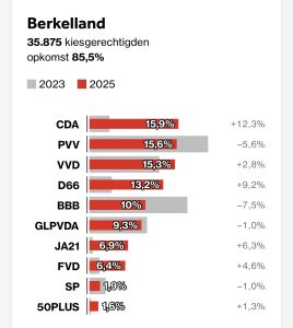 BERKELLAND – In Berkelland is het CDA als winnaar uit de bus gekomen. De partij wordt op de voet gevolgd door de VVD en de PVV. NSC, de partij van Pieter Omzigt, is ook in Berkelland volledig weggevaagd. De BBB, tijdens de laatste Tweede Kamer verkiezingen de grootste partij in Berkelland, heeft flink verloren en is nu de vijfde partij. D66 boekt in Berkelland een flinke winst en wordt daarmee de vierde partij van onze gemeente. JA’21 en Forum voor Democratie doen in Berkelland ook goede zaken. De opkomst lag in Berkelland met 85.5 % ruim boven het landelijk gemiddelde.