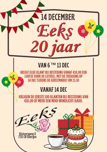 Tijdens de kerstmarkt op 14 december krijgen de eerste 100 klanten die voor meer dan €10 besteden een mooi cadeau van Eelke (op = op). Daarnaast organiseert Eeks een loterij: