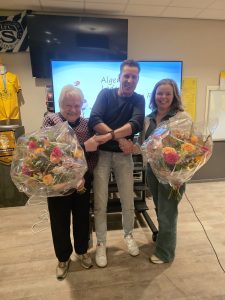 Een bijzonder moment tijdens de vergadering was de huldiging van twee jubilarissen. Bertine Hendriksen en Mini Nijenhuis-Te Slaa zijn beide al 25 jaar onafgebroken lid van de vereniging. Als blijk van waardering kregen zij uit handen van bestuurslid Elvis Buitenhuis het officiële KNGU-bondspeldje en een grote bos bloemen van Bloem en Dingetjes uit Ruurlo.