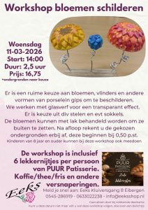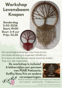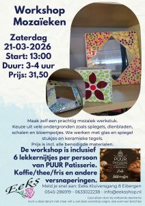 EIBERGEN – Eeks in Eibergen luidt het voorjaar in met een reeks creatieve workshops onder leiding van Eelke. Deelnemers maken onder begeleiding een eigen werkstuk en kiezen uit een ruime variatie aan materialen en kleuren. In maart staan de volgende momenten op de agenda: woensdag 5 maart om 19.00 uur – Levensboom knopen; dinsdag 11 maart om 14.00 uur – Bloemen schilderen; maandag 17 maart om 19.00 uur – Sieraden maken; vrijdag 21 maart om 13.00 uur – Mozaïeken.
