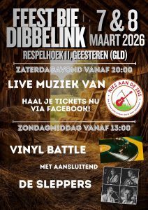 GEESTEREN – In de karakteristieke boerderij aan de Respelhoek 11 in Geesteren staat in het weekend van 7 en 8 maart 2026 alles in het teken van muziek, ontmoeting en ouderwetse gezelligheid tijdens Feest bie Dibbelink. Op zaterdagavond 7 maart barst het feest los vanaf 20.00 uur met live muziek van de band Niks aan de Zeis. Bezoekers die vooraf een kaart kopen, ontvangen bij binnenkomst een muntje. Ook zondag 8 maart belooft een levendige dag te worden. Vanaf 13.00 uur vindt een Vinyl Battle plaats, waarbij muziekliefhebbers het tegen elkaar opnemen met hun favoriete platen. Aansluitend zorgt De Sleppers voor een muzikaal vervolg van de middag. Met een mix van livemuziek, vinylklassiekers en een sfeervolle locatie tussen het hout en het hooi belooft Feest bie Dibbelink een weekend te worden waar nog lang over wordt nagepraat.