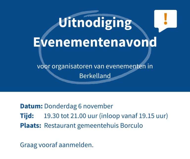 BERKELLAND – Op donderdag 6 november organiseert de gemeente Berkelland een informatieve Evenementenavond voor iedereen